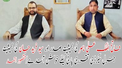 فاتح الملک علی ناصر کی بحیثیت صدر اور سید فرید جان کی بحیثیت جنرل سیکرٹری تقرری پارٹی کیلئے خوش آئند ہے/مقصود احمد