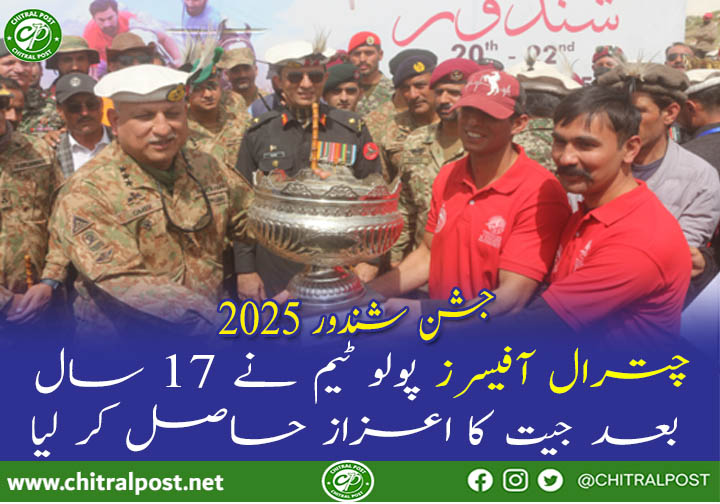 چترال(چ،پ)جشن شندور 2025 میں چترال آفیسرز پولو ٹیم نے گلگت آفیسرز پولو ٹیم کو شکست دیکر 17 سال بعد کامیابی حاصل کر لی۔