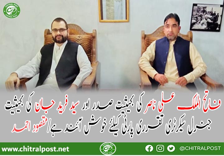 چترال( چ،پ)پاکستان تحریک انصاف لوئر چترال کے سرگرم کارکن اور سپورٹ اینڈ کلچر ونگ کے جنرل سیکرٹری مقصود احمد نے ضلع چترال لوئر کیلئے ممبر صوبائی اسمبلی فاتح الملک علی ناصر کو ضلعی صدر اور تحصیل چیئرمین سید فرید جان کو ضلعی جنرل سیکرٹری مقرر کرنے کے فیصلے کا خیر مقدم کرتے ہوئے دونوں راہنماؤں کو مبارکباد پیش کیا ہے۔