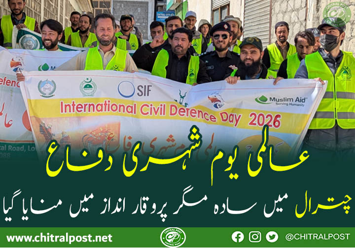 چترال(چ،پ)ڈائریکٹر سول ڈیفنس خیبر پختونخوا زاہد عثمان کاکاخیل کی ہدایت پر دنیا بھر کی طرح ضلع چترال لوئیر میں بھی عالمی یومِ سول ڈیفنس کو جوش و جذبے کے ساتھ منایا گیا۔سول ڈیفنس آفیسر کلیم اللہ کی قیادت میں خصوصی تقریب اور واک کا اہتمام کیا گیا۔