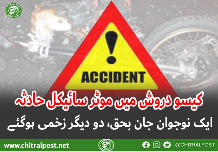 تفصیلات کے مطابق منگل کی شب 11:30 بجے کیسو کیمپ کے مقام پر تیز رفتار موٹر سائیکل آپس میں ٹکرانے سے ایک نوجوان فواد ولد شیر حبیب سکنہ کیسو کیمپ جان بحق جان بحق جبکہ دیگر زخمی ہوگئے جنکی شناخت عرفان ولد سید اور جواد الرحمن ولد محمد ہاشم ساکنان حکیم آباد دروش کے طور پر ہوئی ہے۔